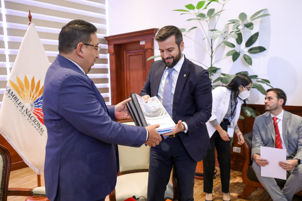 El ministro de Economía, Pablo Arosemena, entregó el informe presupuestario al presidente de la Asamblea, Virgilio Saquicela, y dijo que esta cuenta prevé otorgar una mayor cobertura a la inversión social y una estrategia para reducir el déficit fiscal.