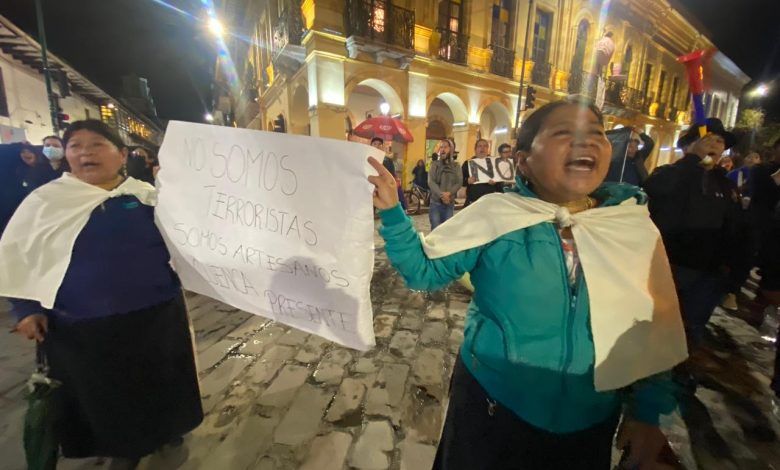 Un grupo de otavaleños se encuentran esta noche en las calles de Cuenca protestando en contra del Gobierno por la…