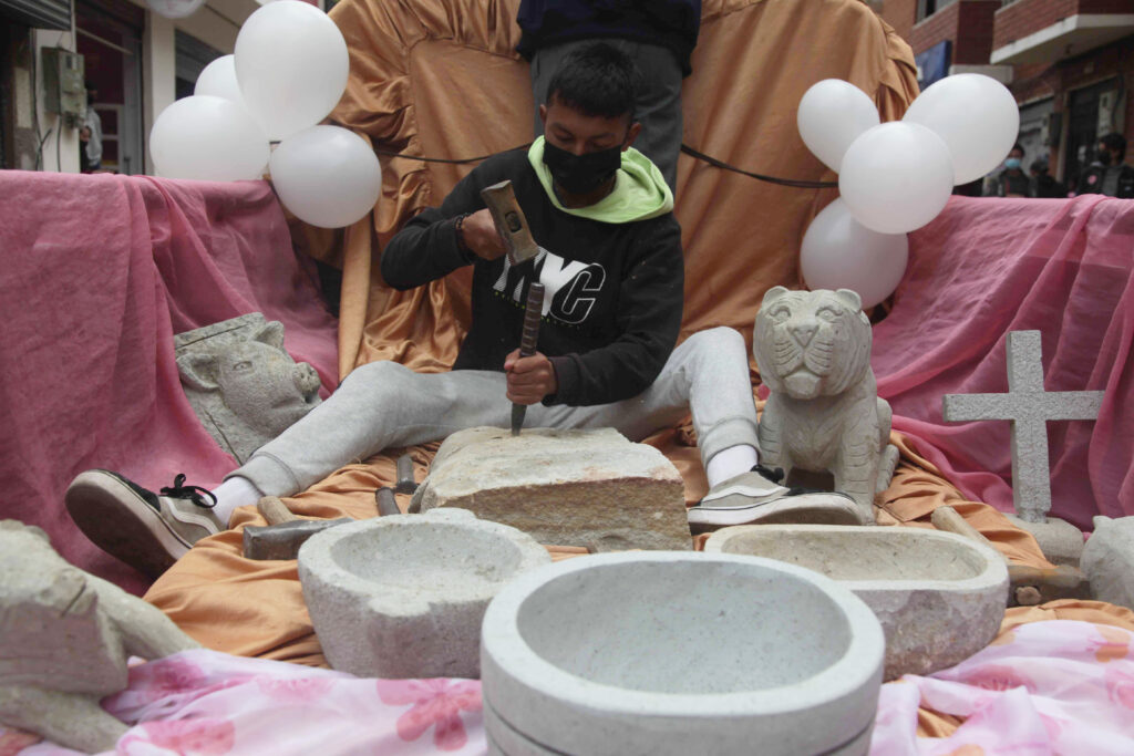 El sonido del cincel al chocar con un fragmento de piedra llamó la atención de los asistentes al desfile. Damián Barragán, un joven de 16 años de edad, de la Unidad Educativa Gabriel Sánchez Luna, recreó en la paila de una camioneta el trabajo de los picapiedreros en las faldas del cerro Cojitambo.