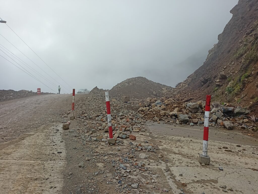 La maquinaria de la contratista trabaja desde el mediodía de ayer en el desprendimiento de material de la parte alta del talud. Esto permite la construcción de bermas (terrazas), cunetas de coronación, así como la colocación de una malla dinámica y la recuperación del tramo vial afectado.