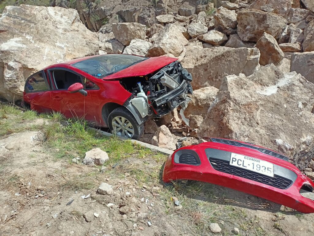 El automotor, de segunda mano valorado en más de 15 mil dólares, quedó totalmente destruido luego de ser impactado por grandes rocas que se desprendieron de lo alto del talud y obstaculizaron la carretera.