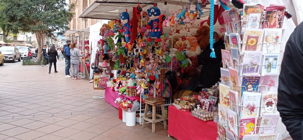 Al igual que los comercios, en la calle Sucre y Benigno Malo también se instaló una feria de pequeños comerciantes. Ofrecen artículos como flores, bisutería, tarjetas, peluches, con alusión a esta época del año.