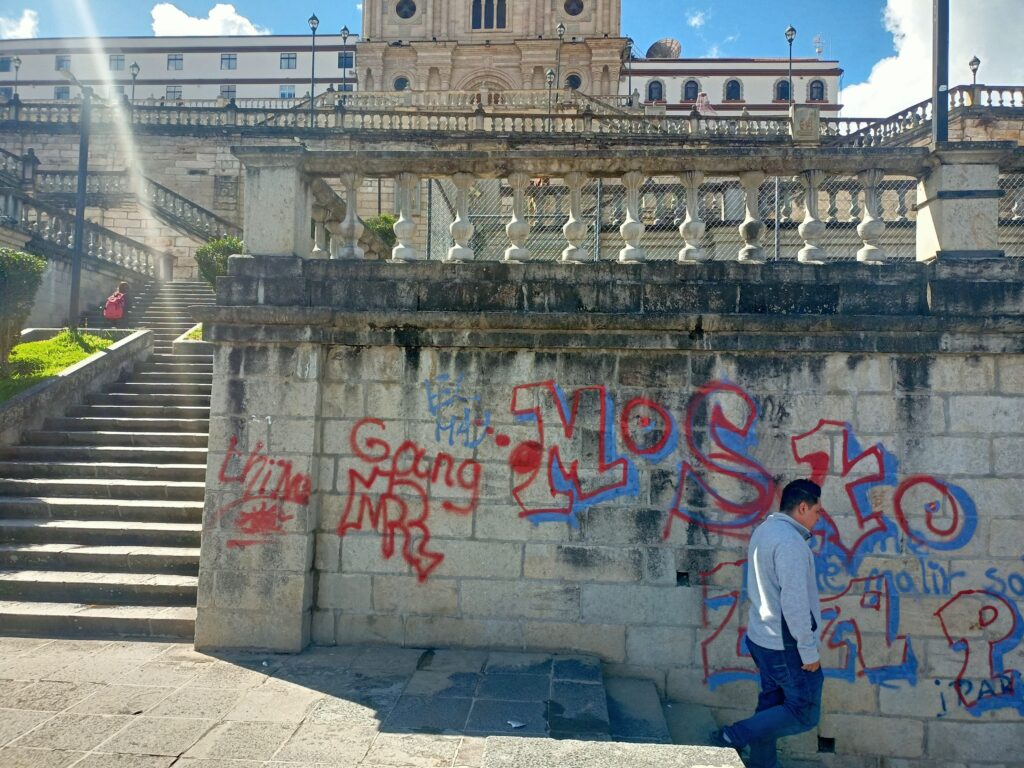 Los muros de piedra, ubicados a lo largo de la escalinata, han sido víctimas desde hace un año aproximadamente de actos vandálicos. Se observan 19 grafitis de mal gusto, de los cuales, alrededor de ocho ocupan una mayor cantidad de espacio.