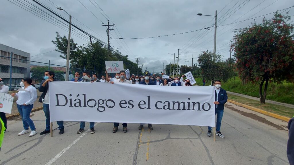 Decenas de dueños de empresas, gerentes, personal administrativo y operativo ubicado en el Parque Industrial realizaron este miércoles, 22 de junio de 2022, un plantón para exigir que a través del diálogo se dé solución a la movilización indefinida del sector indígena y organizaciones sociales.