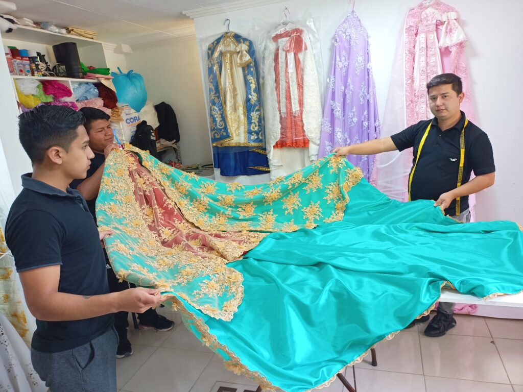 En el taller de Bladimir Torres, ubicado al norte de Cuenca, en las proximidades del Cuartel Dávalos, se confeccionan cinco trajes que lucirá este mes la imagen. Los atuendos están valorados en más de 3.000 dólares y han sido donados por los miembros del Comité 15 de Agosto que lo integran familias cuencanas junto a migrantes que residen en los Estados Unidos (EE.UU.).