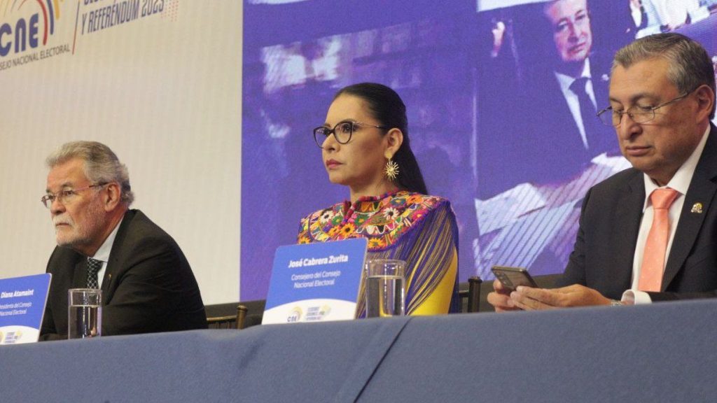 La presidenta del CNE, Diana Atamain, acompañada de los vocales dijo que hasta el mediodía se ha registrado un 33% de electores que ya han ejercido el voto en el país.