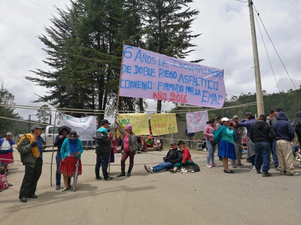 ¡Basta de mentiras!, ¡6 años de incumplimientos de doble riego asfáltico! ¡Levanta la voz! se leía en los letreros colgados sobre cabos que atravesaban toda la vía para bloquear el paso.
