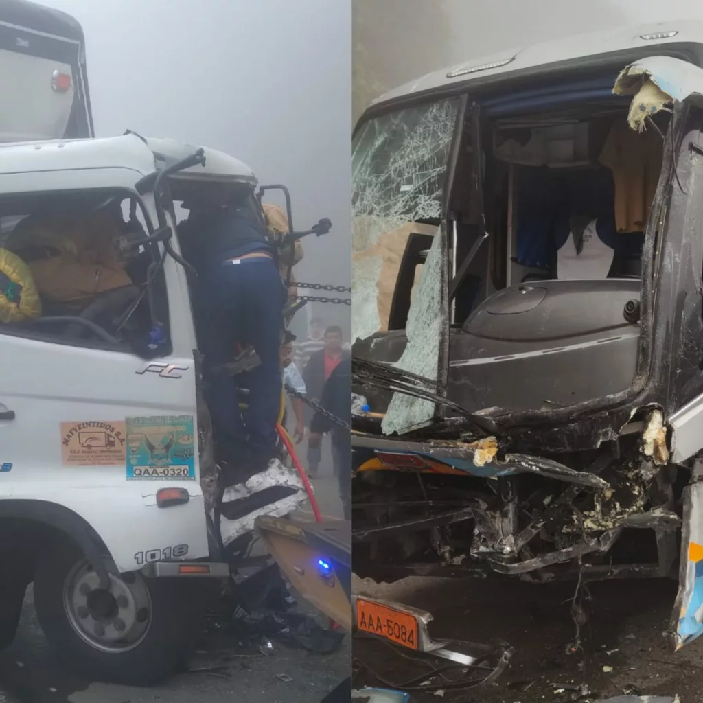 Un bus de transporte interprovincial de la empresa Súper Taxis Cuenca y un camión chocaron de manera frontal en el kilómetro 71 la vía Cuenca – Molleturo – El Empalme la tarde de este miércoles 9 de agosto de 2023.