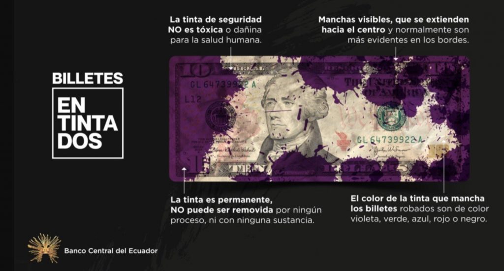 La Asociación de Bancos Privados del Ecuador (Asobanca), alertó a la ciudadanía y a los negocios que no acepten ni cambien billetes entintados o manchados, porque se trataría de dinero robado.