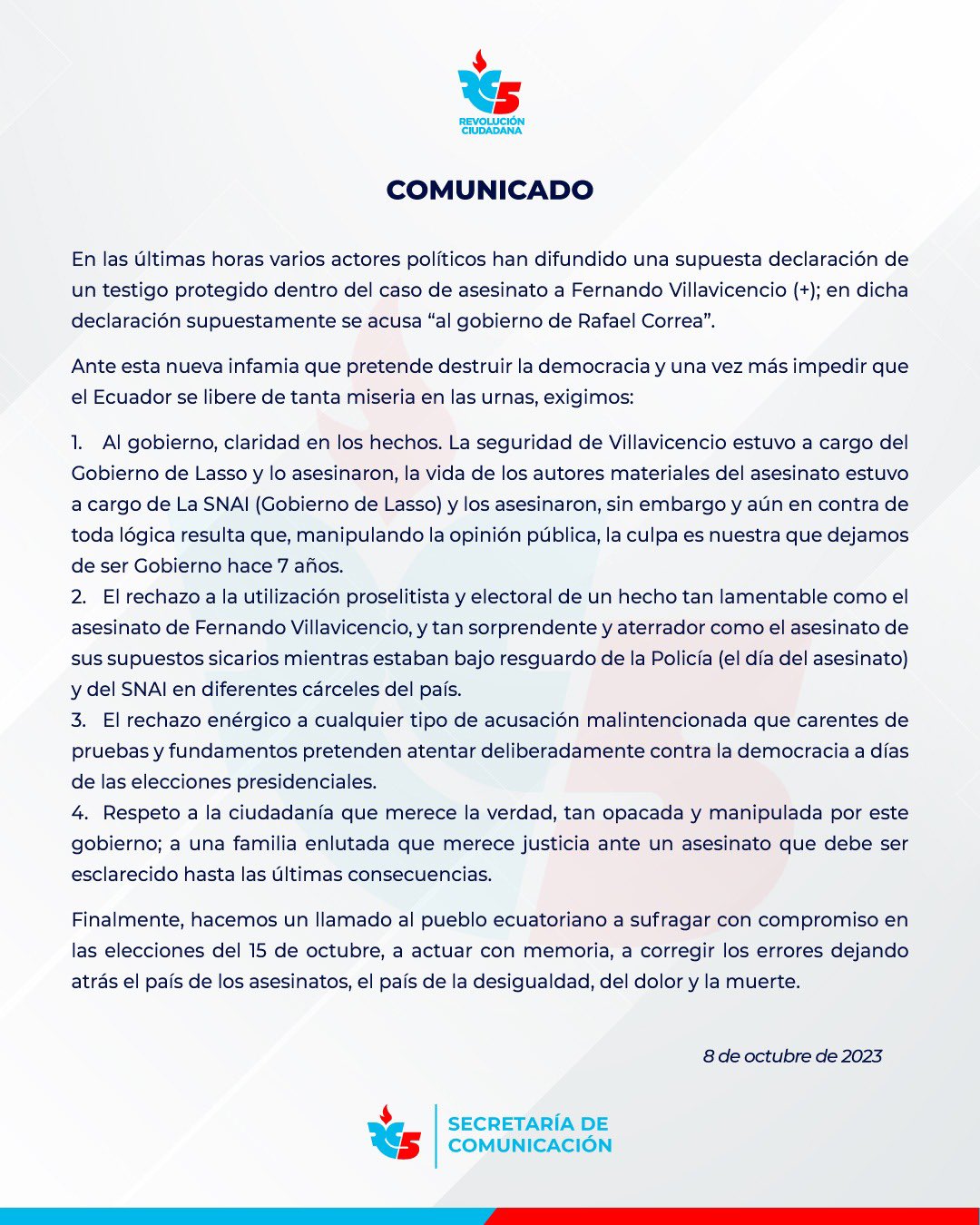 “El rechazo a la utilización proselitista y electoral de un hecho tan lamentable como el asesinato de Fernando Villavicencio, y tan sorprendente y aterrador como el asesinato de sus supuestos sicarios mientras estaban bajo el resguardo de la Policía y del SNAI en las diferentes cárceles del país”, afirmó la organización política.