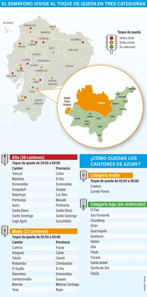 Los 13 cantones restantes de la provincia del Azuay fueron ubicados en la categoría baja, en los que se elimina la restricción de la libertad de tránsito, es decir, no se aplicará el toque de queda que rigió hasta el lunes pasado de 23h00 a 05h00.
