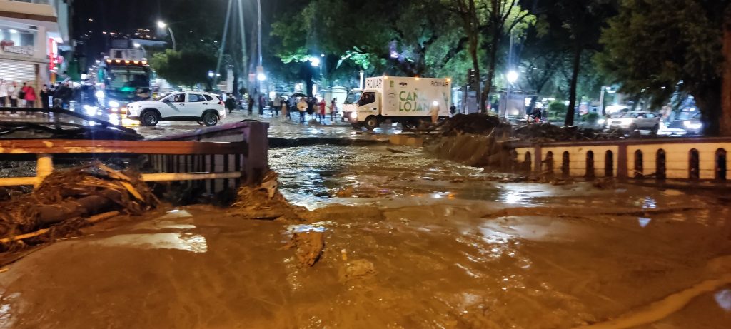 Debido al aumento del caudal del río Malacatos, en Loja, se registró una grave inundación la noche de este lunes 10 de marzo de 2025.