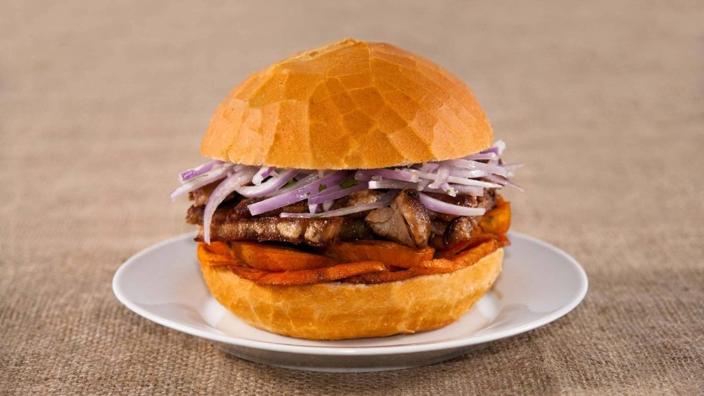 El pan con chicharrón es un plato tradicional peruano que combina carne de cerdo frita con distintos acompañamientos.
