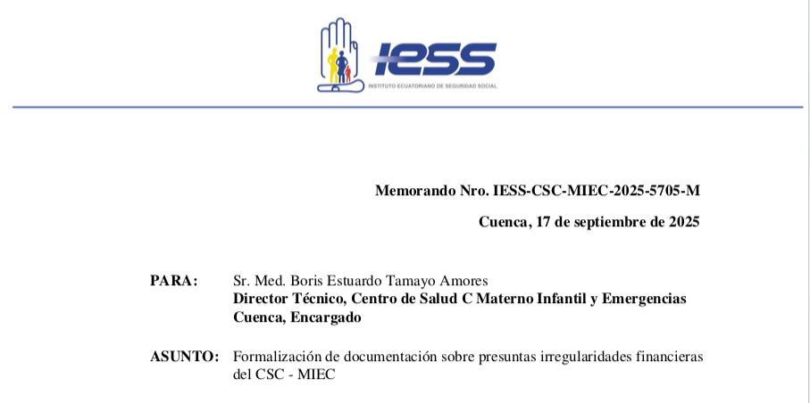 El mismo día que se ingresó la denuncia, se envió el memorando IESS-CSC-MIEC-2025-5705-M al director técnico encargado, Boris Estuardo Tamayo Amores, adjuntando los documentos que evidencian las irregularidades.