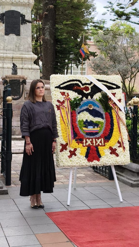La vicepresidenta de la República, María José Pinto, participó en la ceremonia de colocación de ofrendas florales en el parque Calderón, en representación del presidente Daniel Noboa, como parte de los actos conmemorativos por los 205 años de Independencia de Cuenca.