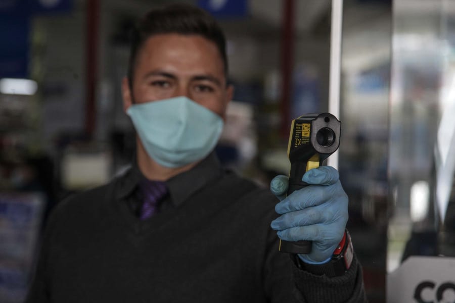 La toma de temperatura se volvió obligatoria en los establecimientos comerciales. Xavier Caivinagua/El Mercurio
