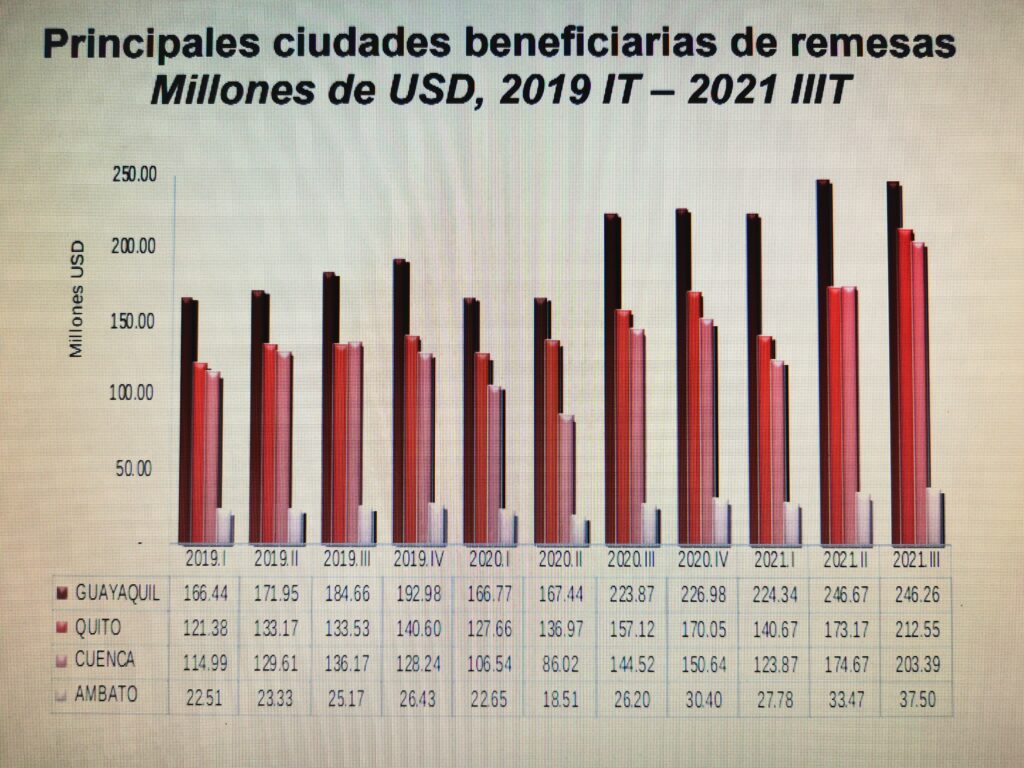 Asimismo, de enero a septiembre de 2021 a todo Ecuador llegó por este concepto un monto de 3.152,926 dólares, de acuerdo con las cifras que reporta el Banco Central del Ecuador (BCE).