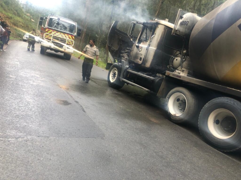 La cabina de un camión mezclador que transportaba hormigón, y que circulaba por la vía San Joaquín Soldados – Chaucha fue incendiada por desconocidos. Este hecho está en investigación.