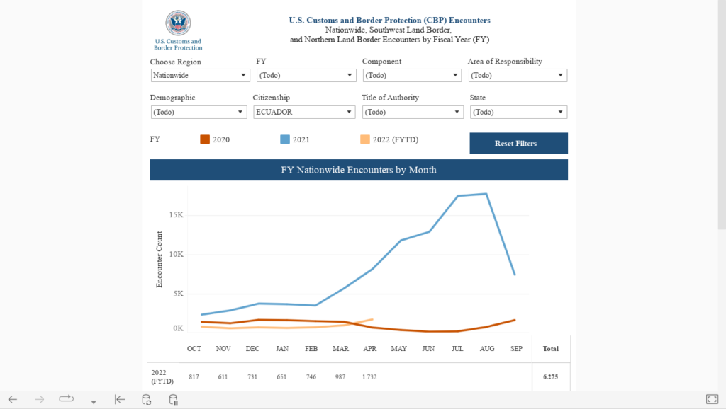Esta dependencia, del gobierno de EE.UU., que se encarga del control de aduanas y protección fronteriza, informó que en abril de este año fueron arrestados 1.732 ecuatorianos, que ingresaron ilegalmente a su territorio.