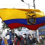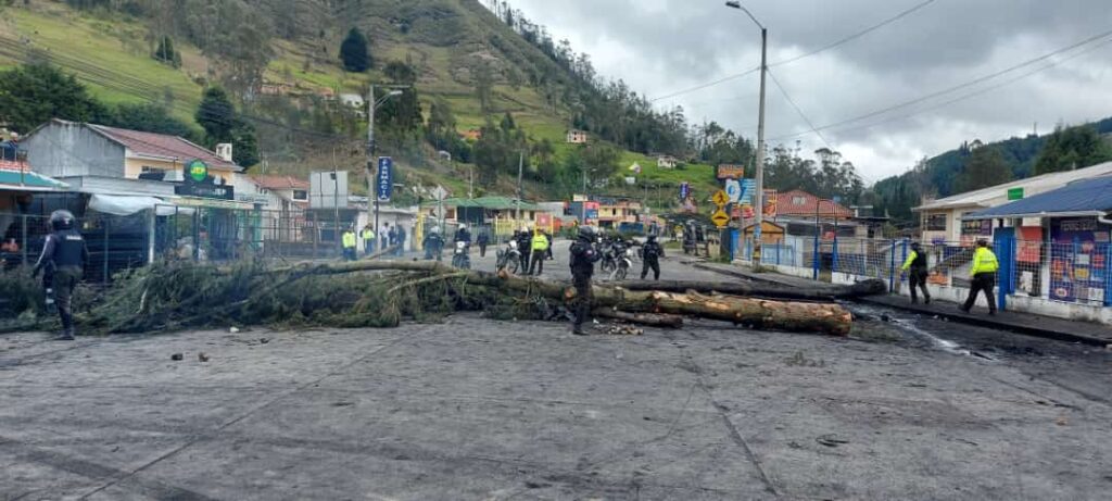 Un piquete de policías llegó la mañana de este sábado 25 de junio de 2022 a la Y de Tarqui, donde un grupo de comuneros mantiene cerrada la vía que conecta a Cuenca con el sur del país.