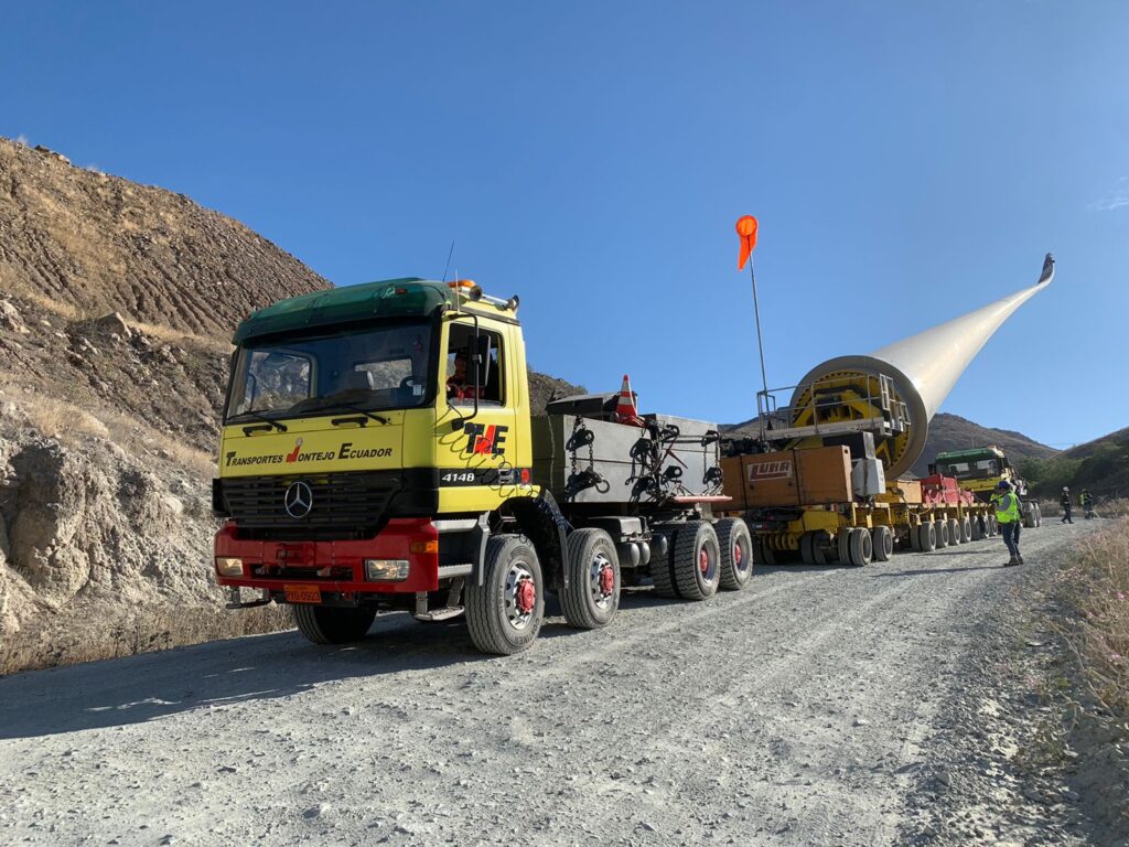 Las palas de los 14 aerogeneradores que convertirán la energía cinética del viento en eléctrica ya están en camino a Huascachaca, en donde se edifica el parque eólico más grande de Ecuador.