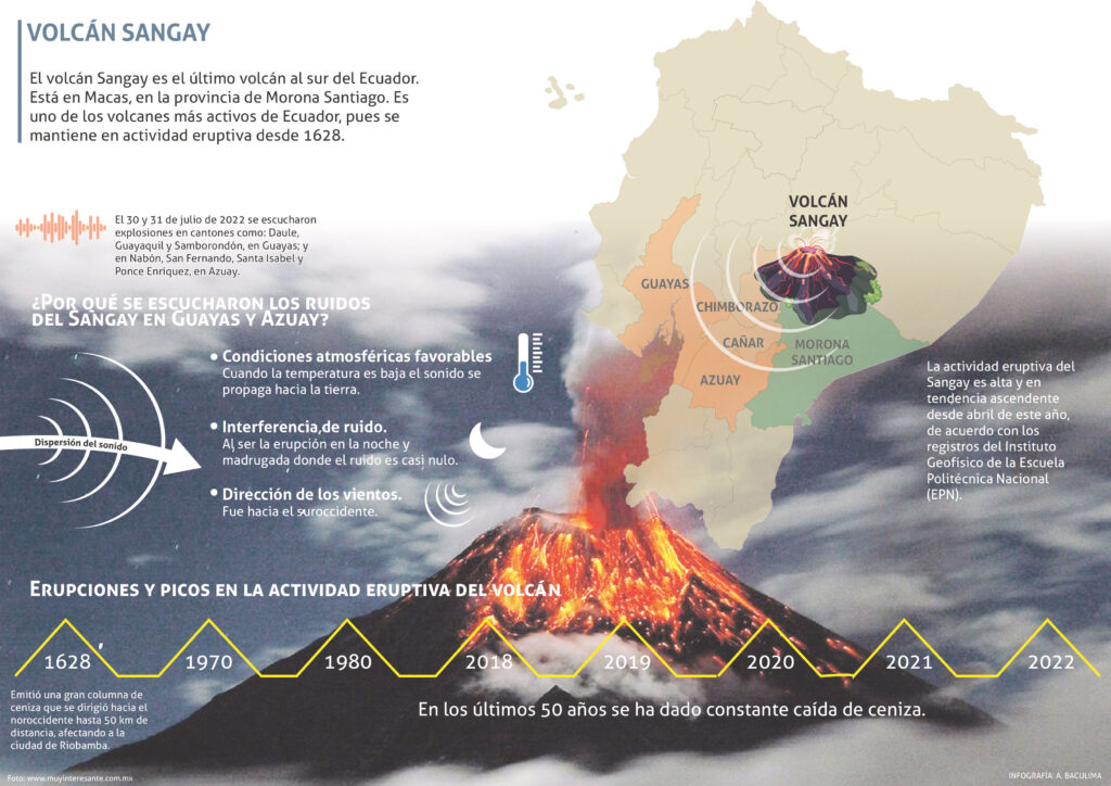 Indicó que luego de conocer los reportes del Instituto Geofísico (IG), de la Escuela Politécnica Nacional (EPN), confirmaron que los sonidos provenían del volcán Sangay, que está en Macas, en Morona Santiago.