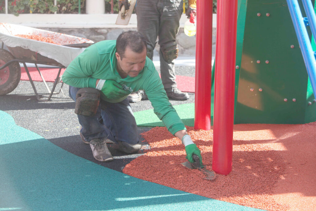 La seguridad infantil es la base del trabajo del cuencano Eddi Peña, quien ha levantado su emprendimiento desde el suelo, mediante la instalación de pisos fabricados a base de caucho reciclado en áreas como parques, pistas atléticas, camineras o alrededor de piscinas.