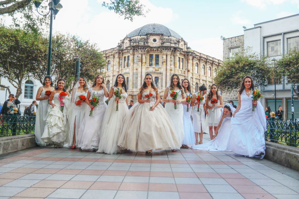 Un grupo de novias, vestidas de blanco, presurosas se dirigen hacia el Parque Calderón. Pasan frente a la iglesia de San Alfonso y, mientras lo hacen, atraen la mirada de transeúntes quienes aprovechan para fotografiarlas.