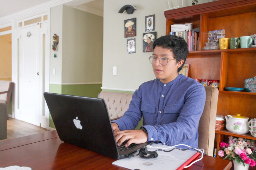 Concentrado y con la mirada fija en la pantalla de su laptop, Josué Loja, estudiante de tercero de bachillerato de la Unidad Daniel Córdova, revisa el contenido de su proyecto de grado que está elaborando para su graduación.