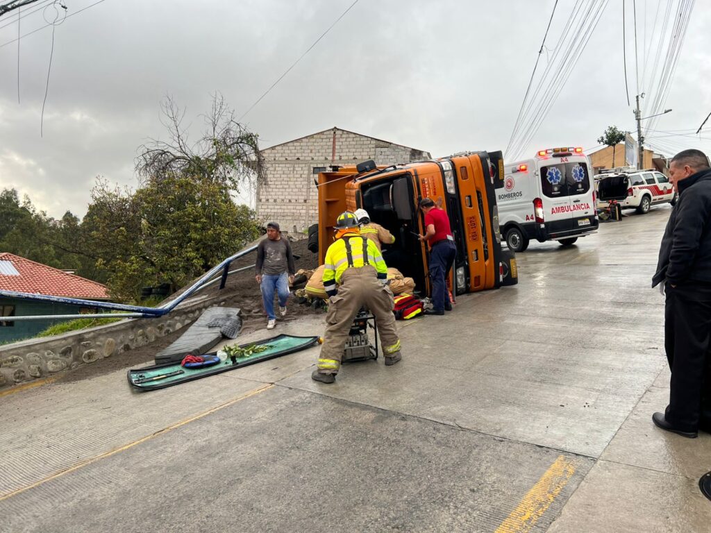 Un volquete se accidentó la tarde de este 6 de diciembre de 2024, en las calles Encuentro Nacional y calle Del Anaco, en el sector Visorrey, al norte de la ciudad de Cuenca.