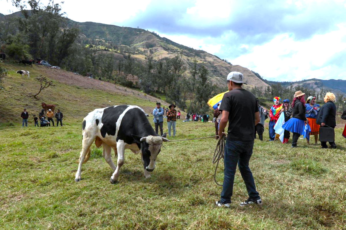 Mientras tanto, los jóvenes guías arrastran el cuero del toro simulando otra corrida. Este elemento es entregado a los “cuentayos”, personajes encargados de atrapar el cuero y arreglar en un armazón de carrizo al que lo denomina “Vaca Loca”, figura central de las Vísperas