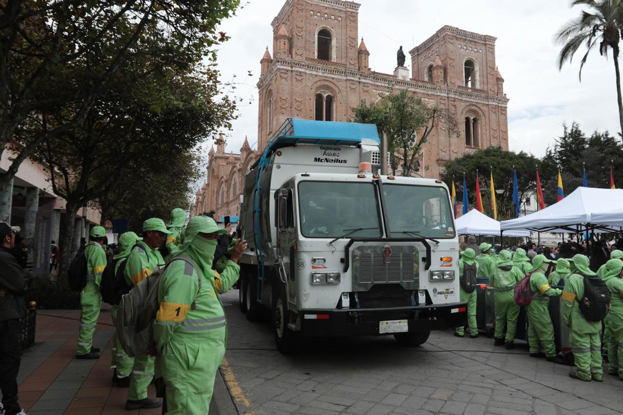 Este 13 de octubre de 2025, obreros de la EMAC y su gerenta, María Caridad Vázquez, se reunieron en el hemiciclo del Parque Calderón para solicitar al Gobierno Nacional que revea su decisión de eliminar el cobro de la tasa de recolección de basuras en Cuenca a través de la Centro Sur.