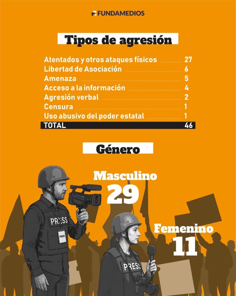 La organización documenta 27 agresiones físicas, cinco amenazas, seis restricciones a la libertad de expresión, dos agresiones verbales, un caso de uso abusivo del poder estatal y cuatro casos de limitación al acceso a la información. Entre las víctimas se cuentan 11 mujeres y 29 hombres.
