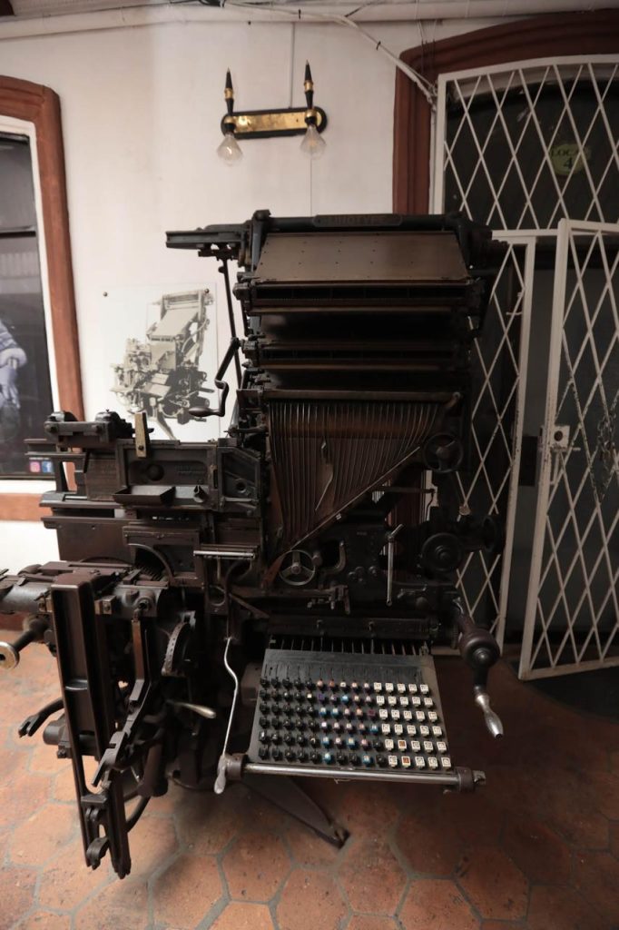 En el centro comercial La Prensa, donde otrora funcionó la planta de El Mercurio, se exhibe una de las primeras máquinas en las que se imprimió el diario de los cuencanos. / XCA