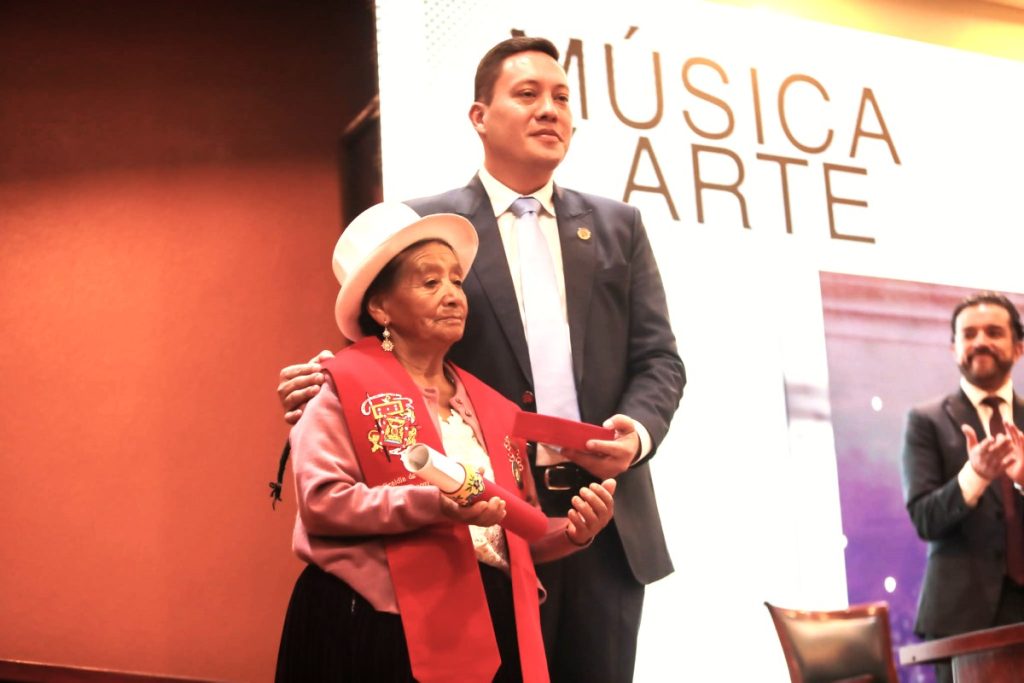 La insignia “Gaspar Sangurima” la recibió Blanca Hurtado Troya, por su labor artesanal y su aporte a la preservación de las tradiciones. El concejal Manuel Alvarado hizo la entrega de esta distinción.