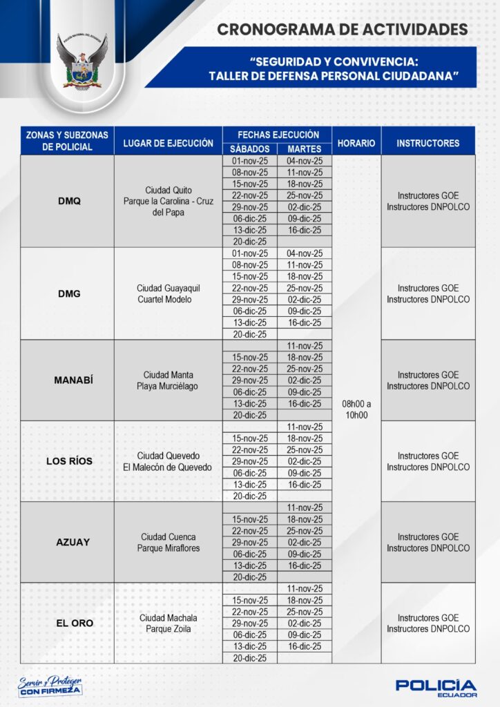 La Policía Nacional del Ecuador inició este 1 de noviembre una serie de talleres de defensa personal ciudadana. Se trata de una iniciativa orientada a fomentar la autoprotección y promover la armonía social en nuestras comunidades.