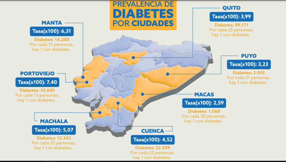 En Cuenca, por cada 22 personas hay una con diabetes; en Quito, una por cada 25; en Machala, una por cada 20; en Macas, una por cada 38; en Manta, una por cada 15; y en Portoviejo, una por cada 13.