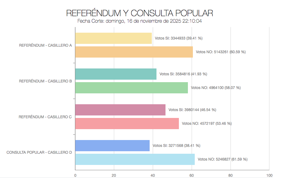 Hasta el cierre de esta edición (21:00 de ayer) y con cerca de 28.000 actas validadas por el Consejo Nacional Electoral (CNE), de los 42.059 totales, el ‘No’ ganaba en las cuatro preguntas.