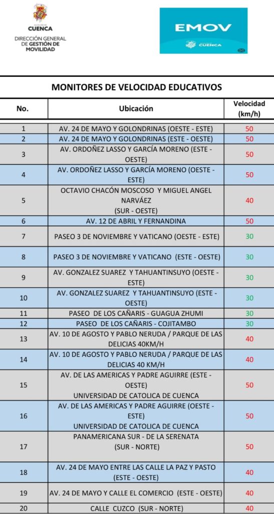 La EMOV EP ha implementado cuatro monitores de velocidad en la avenida 24 de Mayo, dos en la Ordóñez Lasso, dos en la González Suárez, dos en la Paseo de los Cañaris, dos en la avenida De las Américas, dos en el Paseo 3 de Noviembre y dos en la avenida 10 de Agosto.
