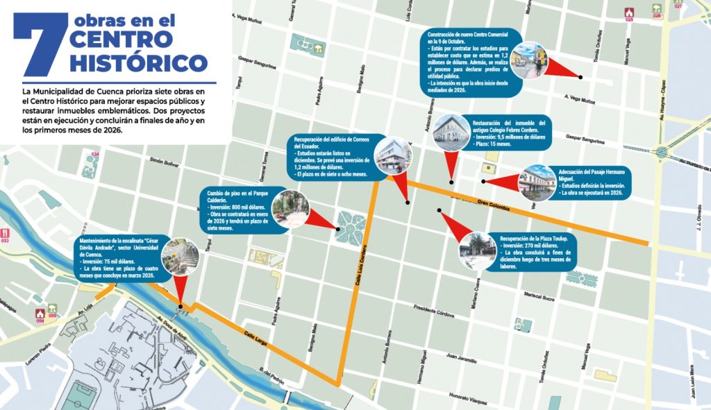 Siete obras se han priorizado para fortalecer el atractivo del Centro Histórico de Cuenca y responder a las necesidades de sus habitantes. Estos proyectos se ubican en puntos estratégicos y conforman una especie de ruta para atraer el turismo.