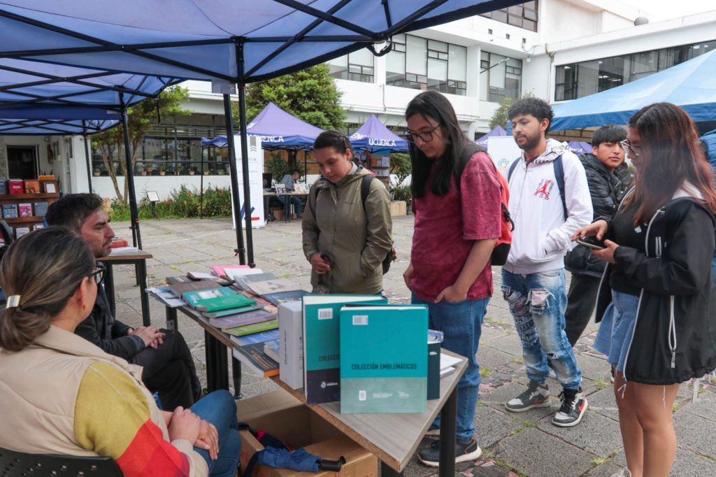 Un grupo de estudiantes participa en la I Muestra de Editoriales Universitarias e Independientes, en el patio central de la Universidad de Cuenca. XCA