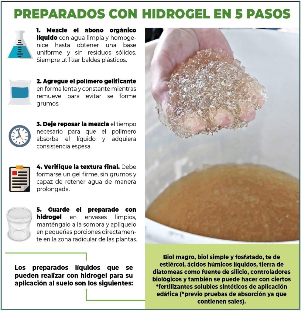 En condiciones de sequía el polímero debe hidratarse previamente y colocarse en la zona de raíces, permitiendo mantener la humedad varias semanas sin riego. Con lluvias, el gel retiene el agua necesaria y el exceso se drena, sin saturar el suelo.