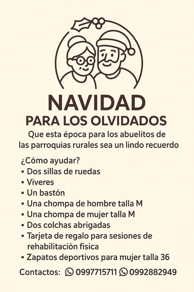 Brindar una Navidad distinta a 10 adultos mayores de las parroquias Octavio Cordero Palacios y Sidcay, en Cuenca, es la meta solidaria de “Navidad Para Los Olvidados”, una campaña que busca cubrir necesidades urgentes y recuperar la cercanía comunitaria.