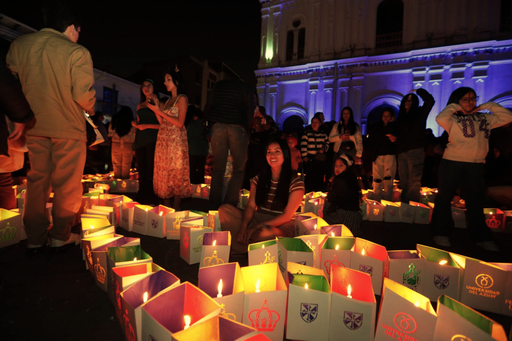 Las figuras iluminadas, entre ellas coronas, ángeles, el santo rosario y escenas sagradas fueron diseñadas por estudiantes de la Universidad del Azuay y por el Municipio.