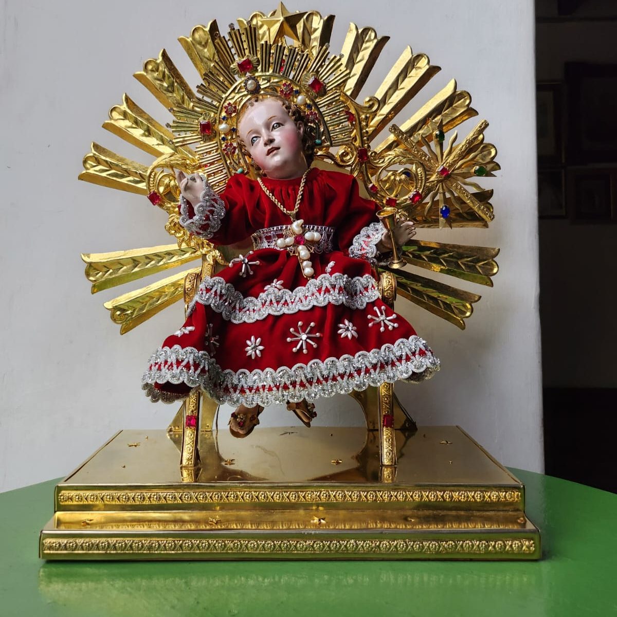 “Llegó pobrecito, ahora es un niño rico”, comenta la madre superiora, refiriéndose a que la imagen llegó con un vestido rojo pequeño, mientras que actualmente sus trajes son bordados con hilos de oro, perlas y dos capas.