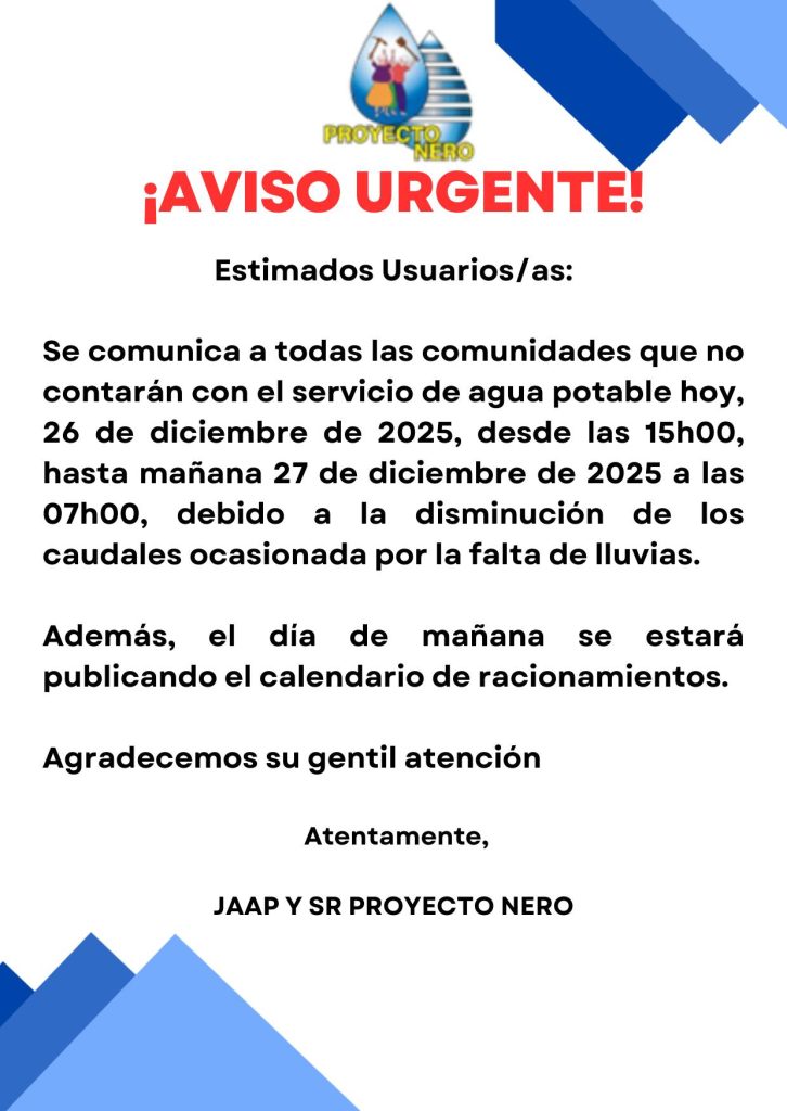 La Junta Administradora de Agua Potable y Saneamiento (JAAPyS) Proyecto Nero, la principal organización comunitaria de agua potable en Azuay, que abastece a 40.000 usuarios en Cuenca, anunció racionamientos del servicio debido a la falta de lluvias.