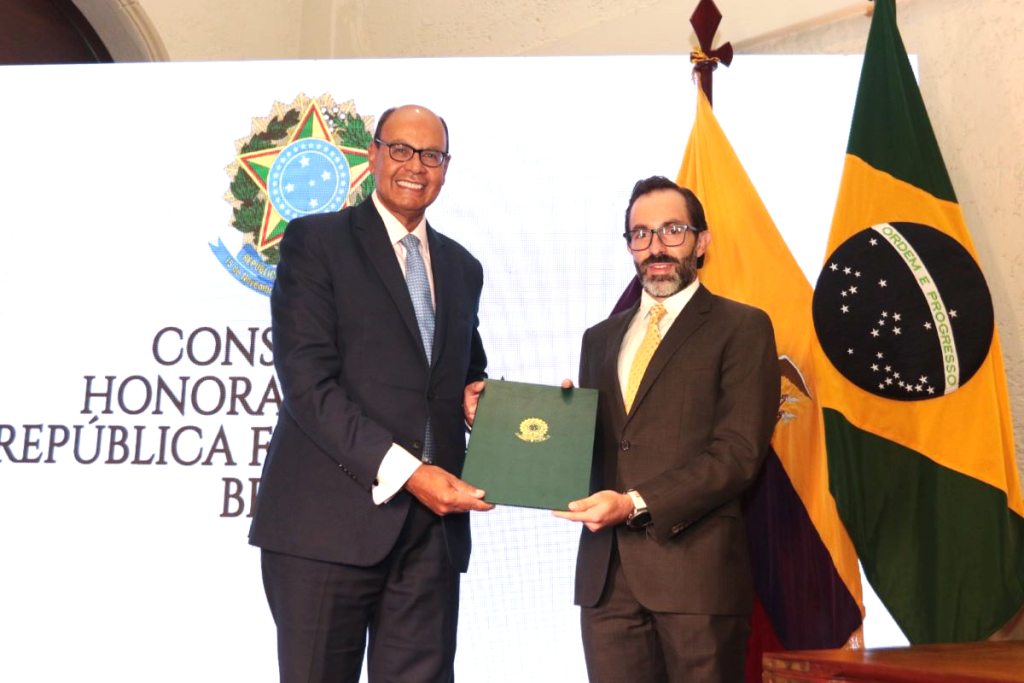 La Cámara de Comercio de Cuenca entregó un reconocimiento al nuevo cónsul honorario y resaltó el papel de los consulados honorarios en la promoción del comercio exterior y la atracción de inversiones. José Miguel Abad, director ejecutivo del gremio, sostuvo que la designación marca el inicio de una nueva etapa para fortalecer el comercio bilateral entre Brasil y Ecuador.