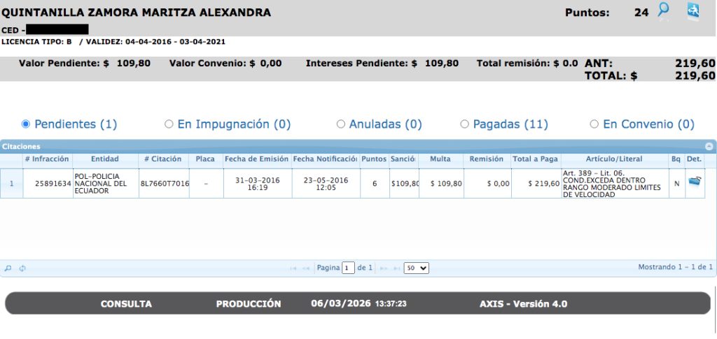 Además, en la ANT consta que Quintanilla registra un valor pendiente de pago de 219,60 dólares por exceder los límites de velocidad, hecho sancionado en el artículo 389 del COIP.