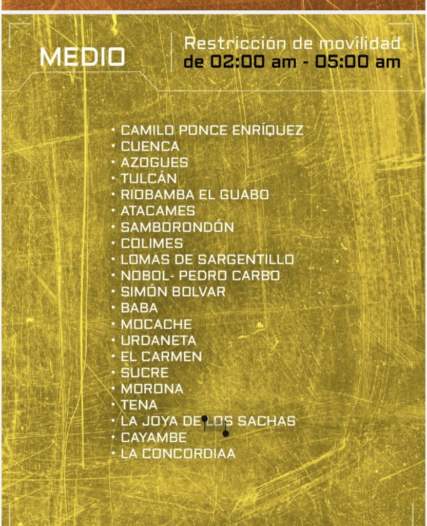 El toque de queda en la restricción ‘media’ comprende de 02:00 a 05:00, y en este se incluiría aCuenca y Camilo Ponce Enríquez.