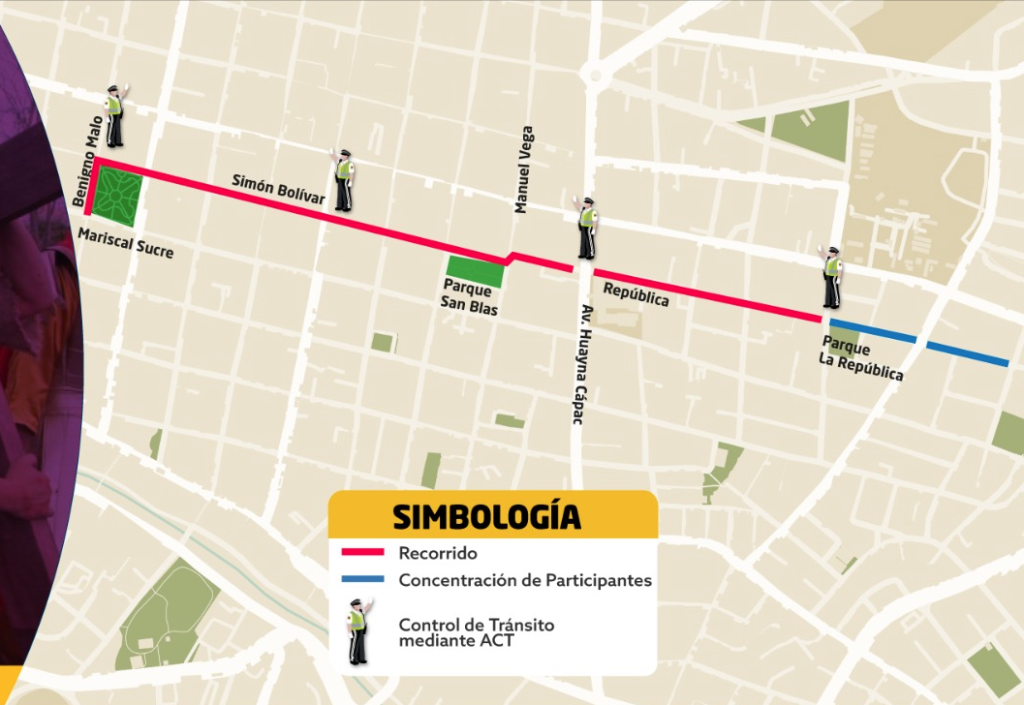 Los devotos caminarán sobre la calle República, cruzarán la avenida Huayna Cápac y tomarán la calle Bolívar con dirección a la Catedral de la Inmaculada Concepción en el Centro Histórico.